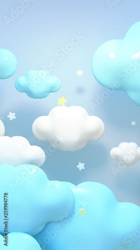 Kawaii blue clouds and stars. 3d rendering picture. (Vertical)