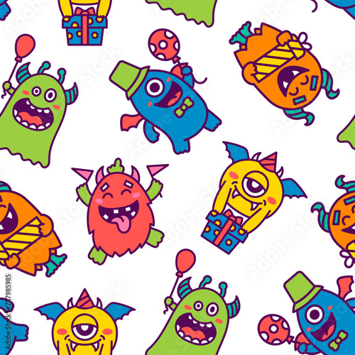 Kawaii cute party monsters. Seamless pattern. Happy birthday gifts, funny alien, greeting cake. Hand drawn style. Vector drawing. Design ornaments.