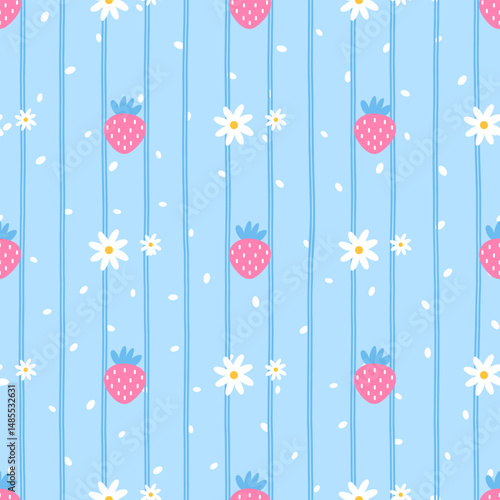 Kawaii Seamless pattern with cute wild strawberries and flowers. Vector design for summer fabric, wrapping, and kids prints