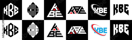 KBE letter logo design in six style. KBE polygon, circle, triangle, hexagon, flat and simple style with black and white color variation letter logo set in one artboard. KBE minimalist and classic logo