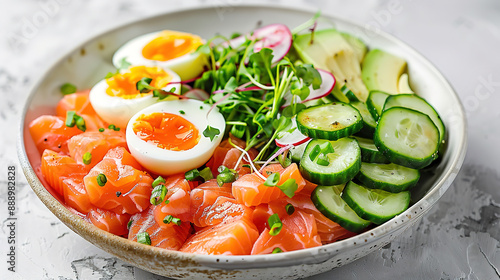 Ketogenic diet breakfast. Salt salmon salad with greens, cucumbers, eggs and avocado. on plain white kitchen counter background. Keto/paleo lunch. Top view