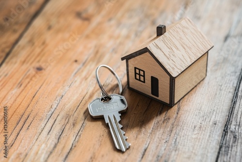 Key and Wooden House on Wooden Table for Home or Realty Concept
