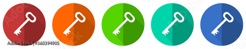 Key icon set, red, blue, green and orange flat design web buttons isolated on white background, vector illustration