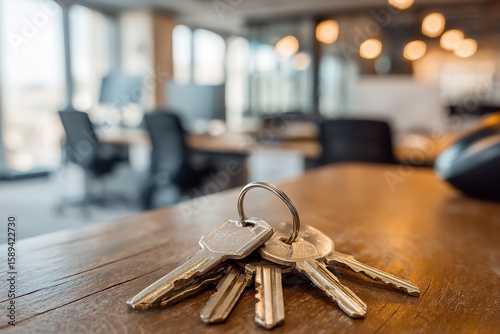 Key Ring with Shiny Locks on Table in Blurred Office Setting, Emphasizing Workplace Safety and Access Control