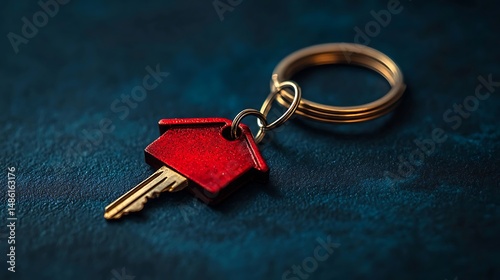 Key to New Beginnings: A close-up shot of a key with a house-shaped keychain, resting on a dark, textured surface. Evoking themes of ownership, security, and the potential for new chapters.