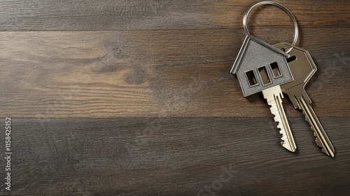 key with house shaped keychain rests on wooden surface, symbolizing home ownership and security. This evokes feelings of comfort and stability