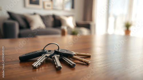 Keys on the table in blurred new apartment or hotel room. Mortgage, investment, rent, real estate, property concept.