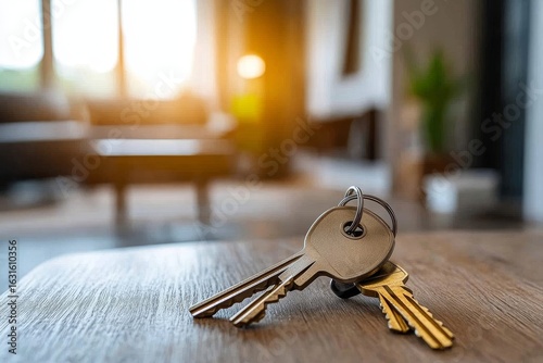 Keys placed on a table in a new apartment or hotel room, representing the concept of new beginnings, homeownership, or travel, Generative AI