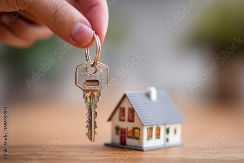 Keys to a new home: A symbol of homeownership and dreams, held gently in hand with a miniature house.