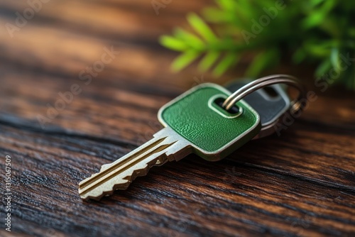 Keys with a green and gray fob rest on dark, grained wooden surface, surrounded by green foliage