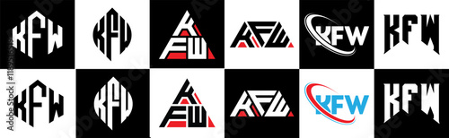 KFW letter logo design in six style. KFW polygon, circle, triangle, hexagon, flat and simple style with black and white color variation letter logo set in one artboard. KFW minimalist and classic logo