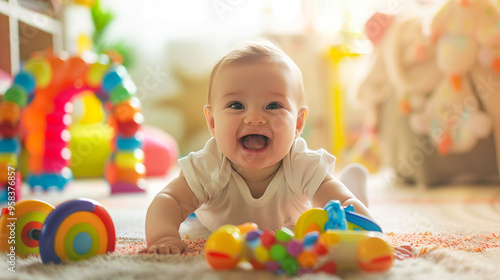 Kid is crawling on floor with toys and smiling at camera. Baby portrait