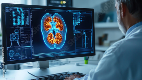 Kidney disease doctor with digital human model image on screen of desktop computer.