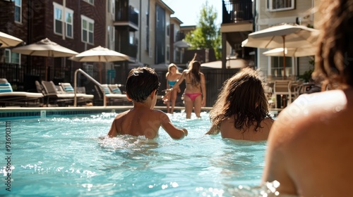 Kids are happily playing in a hotel pool, splashing water and enjoying a sunny day surrounded by umbrellas and nearby apartments