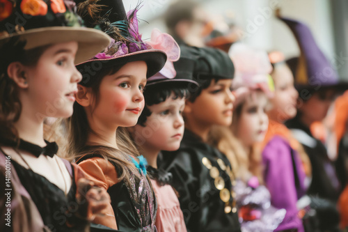 Kids in Halloween costumes standing in line during a costume contest, waiting for the judges' evaluation