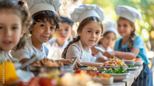 kids pretending to be chefs in a makeshift kitchen, creating imaginative dishes and enjoying creative play, with copy space for text