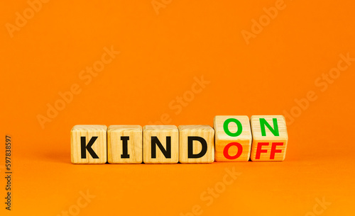 Kind on or off symbol. Businessman turns wooden cubes and changes word Kind off to Kind on. Beautiful orange table orange background. Business and kind on or off concept. Copy space.