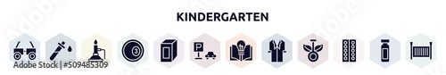 kindergarten filled icons set. glyph icons such as testing glasses, blood test, bunsen burner, ball pool, juice box, car park, theory, lab coat, blister icon.