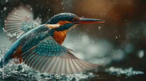Kingfisher bird dips into the water to catch fish in natural river environment during daytime