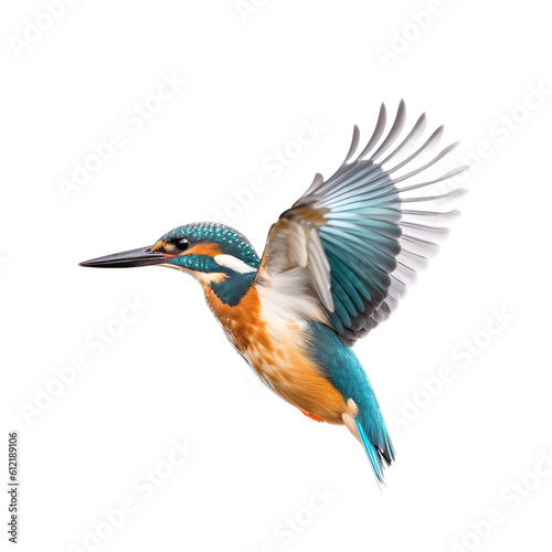 Kingfisher bird Flying in the air with open wingspan isolated on white background, Generative Ai