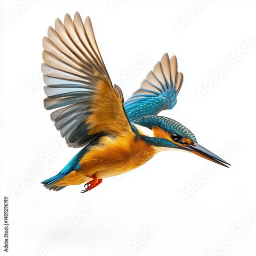 Kingfisher bird in flight showcasing vibrant colors with wings spread open against a white background