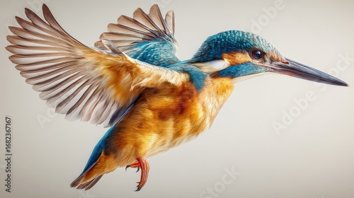 Kingfisher Bird Soaring with Open Wings, Beautiful Plumage, Wildlife Bird Isolated on White Background