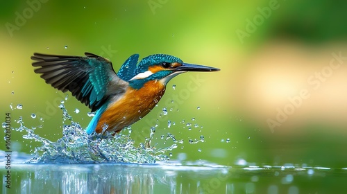 Kingfisher diving into clear water, dynamic splash, focused hunting, vibrant colors