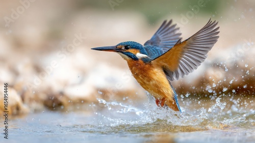 Kingfisher in Action: A stunning close-up captures the vibrant kingfisher in mid-flight as it emerges from the water with dynamic, its wings outstretched, revealing nature's vivid beauty.