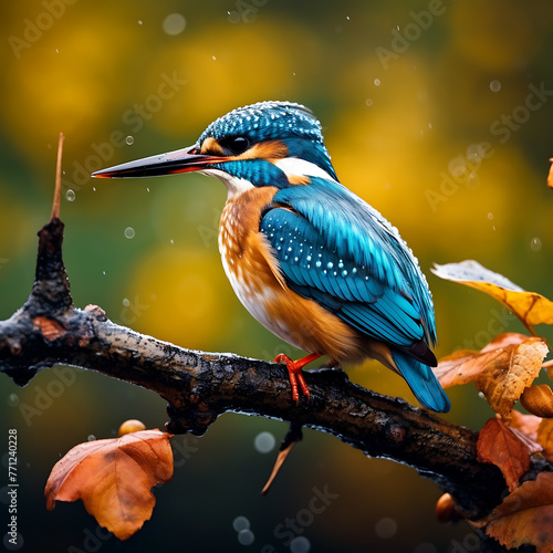 Kingfisher on the branch in autumn forest. Colorful background with bird.