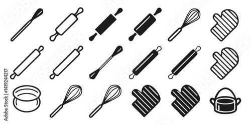 Kitchen Cooking Tools Vector Set with Rolling Pins, Whisks, Pots, and Oven Mitts