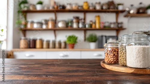 Kitchen counter with jars of food; blurred background of a pantry with shelves