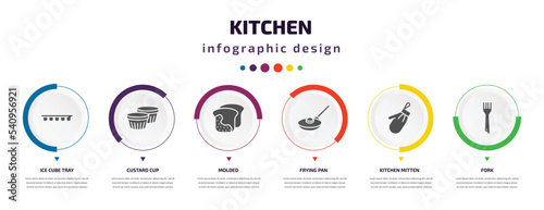 kitchen infographic element with icons and 6 step or option. kitchen icons such as ice cube tray, custard cup, molded, frying pan, kitchen mitten, fork vector. can be used for banner, info graph,