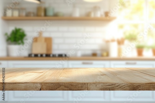 kitchen table background, wood counter top on blur of white clean abstract home interior with bokeh. used for display or montage your wooden for dining background. table banner, ai