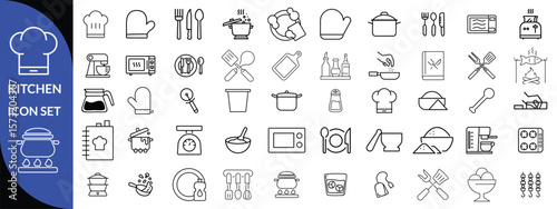 Kitchen Utensil icon set. Editable Stroke Icon Collection. Includes chopping board, cooking pots, frying pan, grater, kitchen scale, and More. Outline icons vector collection