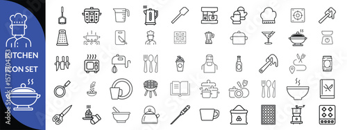 Kitchen Utensil icon set. Editable Stroke Icon Collection. Includes chopping board, cooking pots, frying pan, grater, kitchen scale, and More. Outline icons vector collection