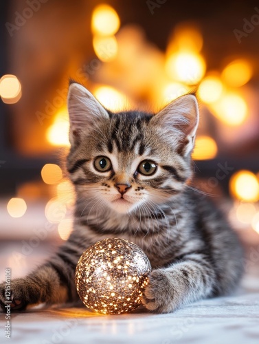 Kitten by Fireplace Lights - Adorable tabby kitten rests near a glowing decorative ball, with a warm fireplace bokeh background.