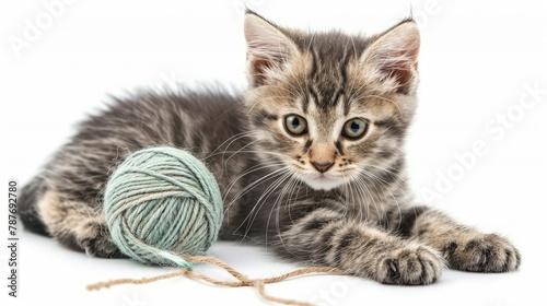 Kitten with ball of yarn isolated on white background.