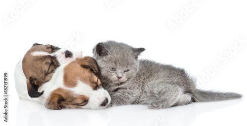 Kitten with sleeping puppies Jack Russell. isolated on white background
