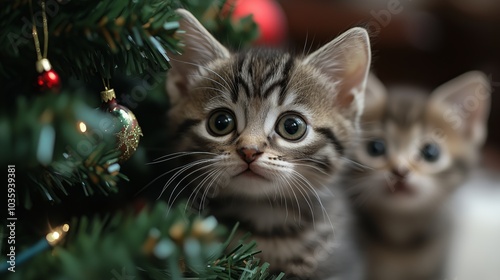 kittens captivated by the sparkling lights and decorations of a Christmas tree