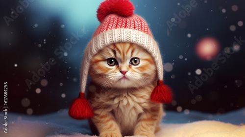 Kittens in Christmas costumes on a festive background. Happy Christmas background. Cute kitten on a Christmas background in a cute costume. AI Generative.