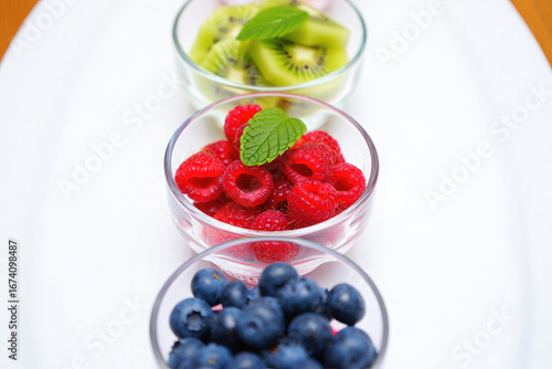 Kiwi raspberries and blueberries in glass bowls on a white plate with mint leaves