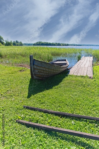 Kizhi Island, Russia, July 10, 2024. Vintage wooden boat on the shore.