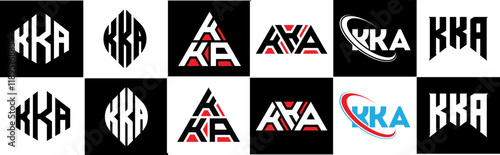 KKA letter logo design in six style. KKA polygon, circle, triangle, hexagon, flat and simple style with black and white color variation letter logo set in one artboard. KKA minimalist and classic logo
