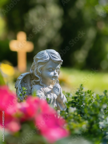 Kleiner Engel sitzt betend in Blumen, vor Holzkreuz