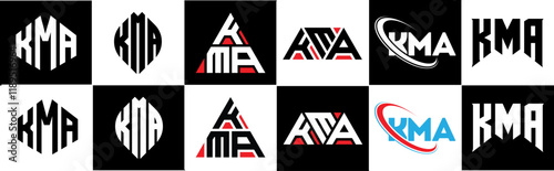 KMA letter logo design in six style. KMA polygon, circle, triangle, hexagon, flat and simple style with black and white color variation letter logo set in one artboard. KMA minimalist and classic logo