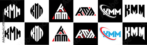 KMM letter logo design in six style. KMM polygon, circle, triangle, hexagon, flat and simple style with black and white color variation letter logo set in one artboard. KMM minimalist and classic logo