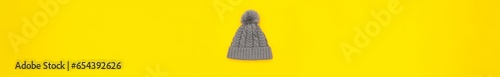 Knitted grey winter hat with pompon in middle on bright yellow background. Cozy knitted accessory in trendy color, warm concept. Flat lay, banner, copy space