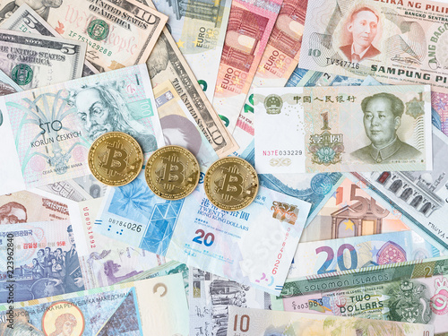 Known worldwide crypto currency Bitcoin. Coins that lie on currency banknotes of different countries. Background.