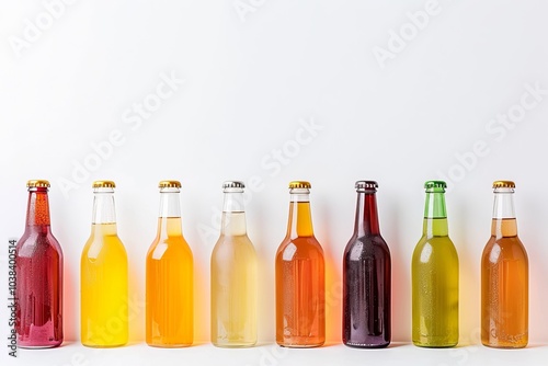 Kombucha mushroom.Kombucha.Fermented kombucha tea.A collection of colorful kombucha bottles with different flavors arranged on a white background.Copy space on the top.