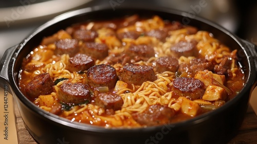 Korean Budae Jjigae: Spicy Army Stew with Sausage and Toppings